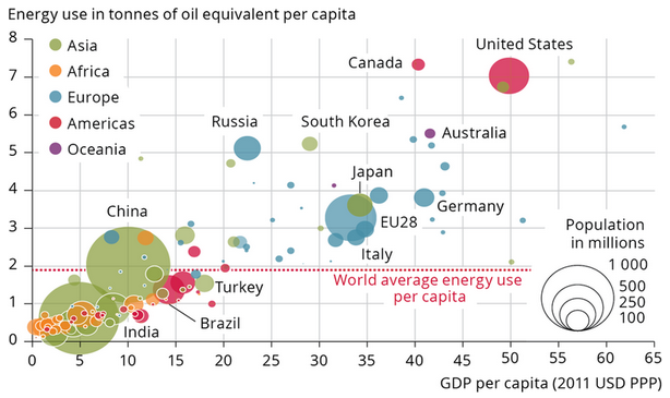สหรัฐอเมริกาใช้พลังงานต่อคนเฉลี่ยมากที่สุดในโลกแต่ก็มีอัตรา GDP ต่อคนสูงเช่นเดียวกัน